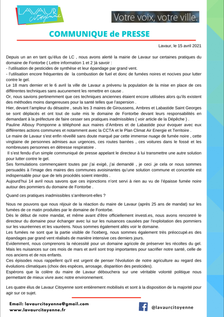 Le maire de Lavaur, après avoir fait de grands effets de manche et porté plainte contre les vergers, juste après le sinistre (pendant lequel, rappelons-le, il n’était pas présent sur Lavaur), a pris ses distances par rapport à se plainte, avec une politique de « brossage dans le sens du poil » de la direction des vergers. Souvenons-nous de la campagne d’affichage, réalisée sur des fonds publics, reprenant le slogan « Mangez des pommes », ou, plus récemment, son message sur les réseaux sociaux à l’occasion de la journée portes ouvertes du domaine de Fontorbe.