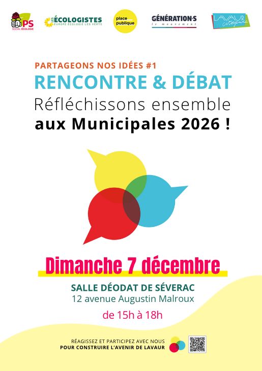 Les élus Lavaur Citoyenne et le groupement de listes citoyennes et de mouvements politiques de gauche à Lavaur proposent un nouveau temps d’échanges public avec les habitants, pour partager nos idées. Il aura lieu le dimanche 7 décembre prochain dès 15h00, à la maison de la musique (la salle Déodat De Séverac ) 12 rue Malroux à Lavaur. Il s’agira cette fois-ci d’une rencontre débats avec des ateliers de travail sur le projet 2026-2032.